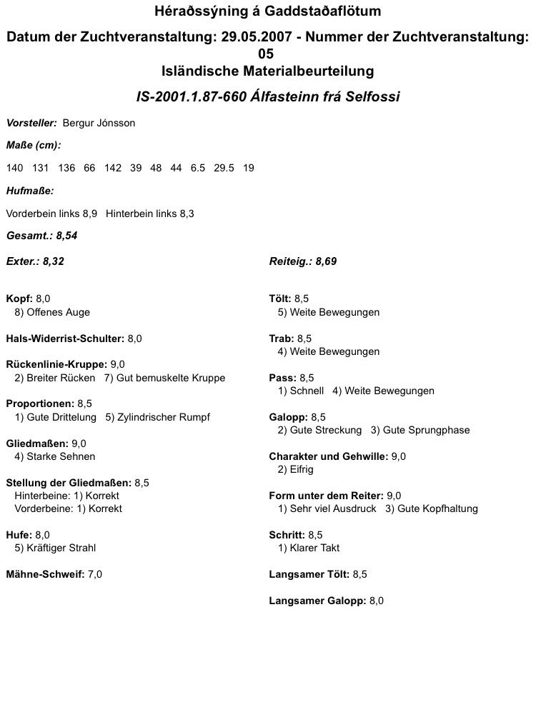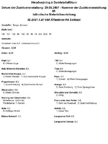 "Großes, sehr gut entwickeltes Hengstfohlen mit sehr guten Momenten im Tölt, bei hochweiten, akzentuierten Bewegungen, ordentlichem Trab und etwas gelaufenem Galopp. Präsentierte sich sehr selbstbewußt."