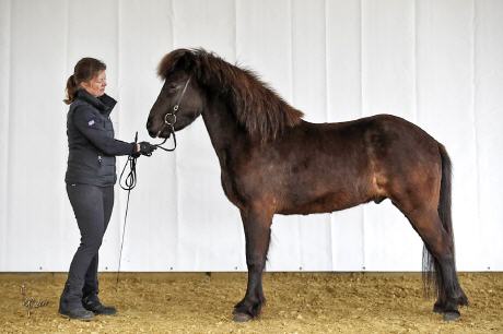 Snerra frá Reykjavík - eine vielversprechende Fünfgangstute - hat sich kurz vor ihrer ersten FIZO leider so schwer verletzt, dass sie nicht mehr geritten vorgestellt werden konnte. Sie ist eine Tochter vom Ehrenpreis-Hengst Gustur frá Hóli (FIZO: 8,57 (8,13 + 9,01) mit 9,0 für Tölt) und Sjöfn frá Hala (FIZO: 7,93 (7,73 + 8,13)).